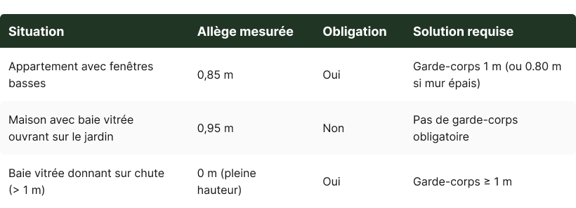- Allège < 0,90 m → le garde-corps devient obligatoire.
