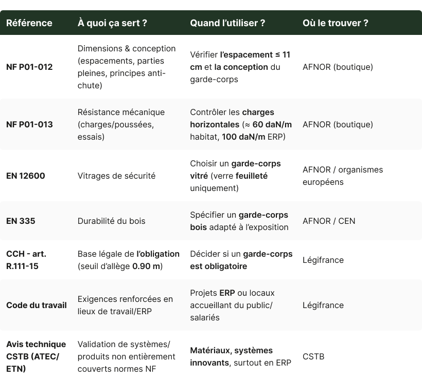 Ce tableau récapitule les normes et textes spécifiquement applicables aux garde-corps de fenêtre (habitat et ERP).